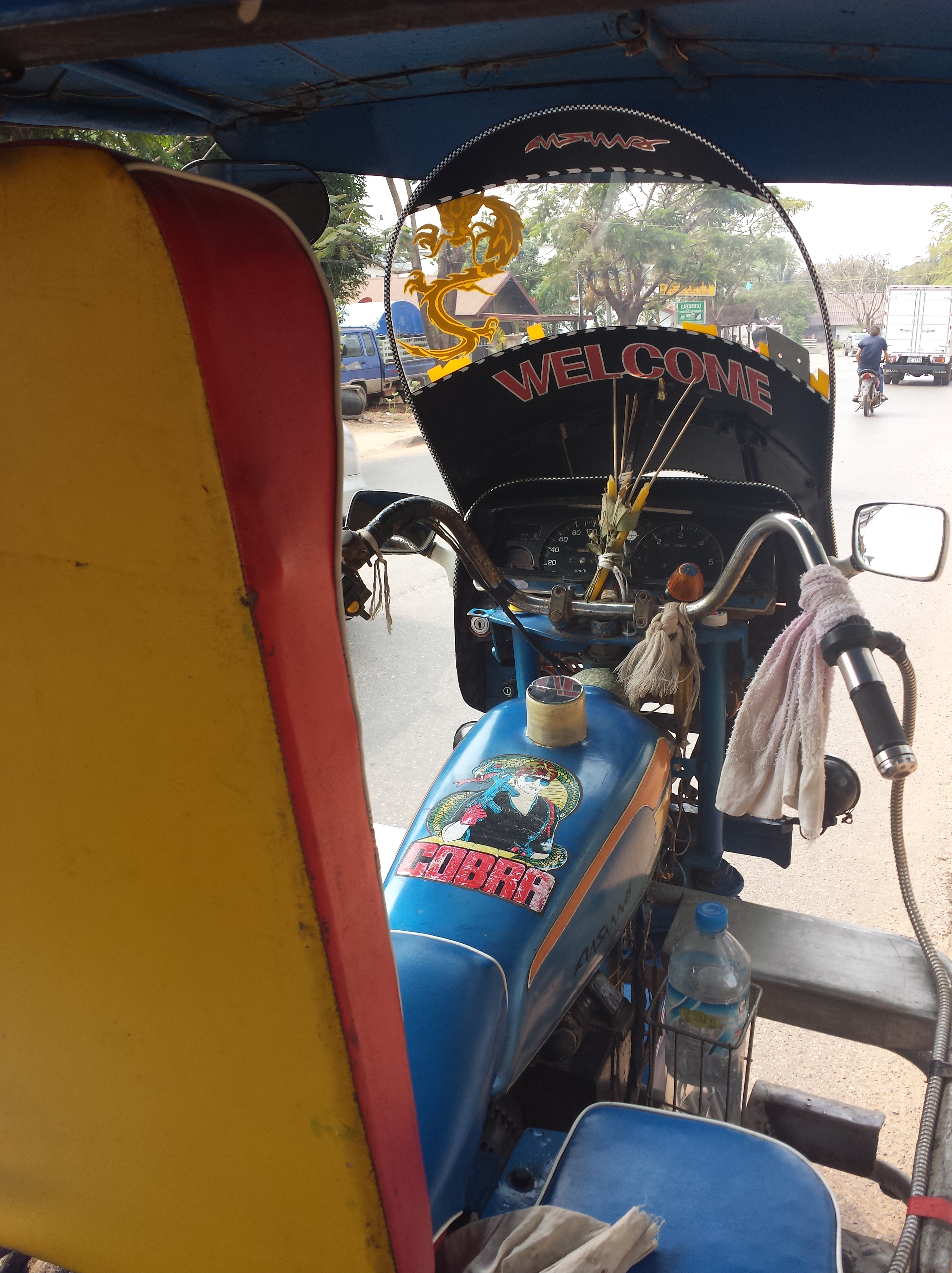 Ich habe für die Strecke einen Sleeping-Bus ab Vientiane gebucht. Dorthin bringt uns in einer 4-stündigen Fahrt ein Reisebus, der seine besten Zeiten schon eine Weile hinter sich hat. Als wir in Vietiane etwas abgelegen ankommen und alle Mitreisenden nach Bangkok und Vientiane auf die vorhandenen Tuk-Tuks verteilt sind, stehe ich plötzlich alleine im Dunkeln da. Man versichert mir aber, dass bald jemand kommt und tatsächlich liest mich kurz später ein 12er Tuk-Tuk auf. Die nachfolgende Stadtrundfahrt während der Rush-Hour ist praktisch ein kostenloser Service. Insgesamt 18 Personen haben wir nach drei Rundfahrten an Bord, aber alle mit Sitzplatz und sei es auf dem Plastikhocker mittendrin.