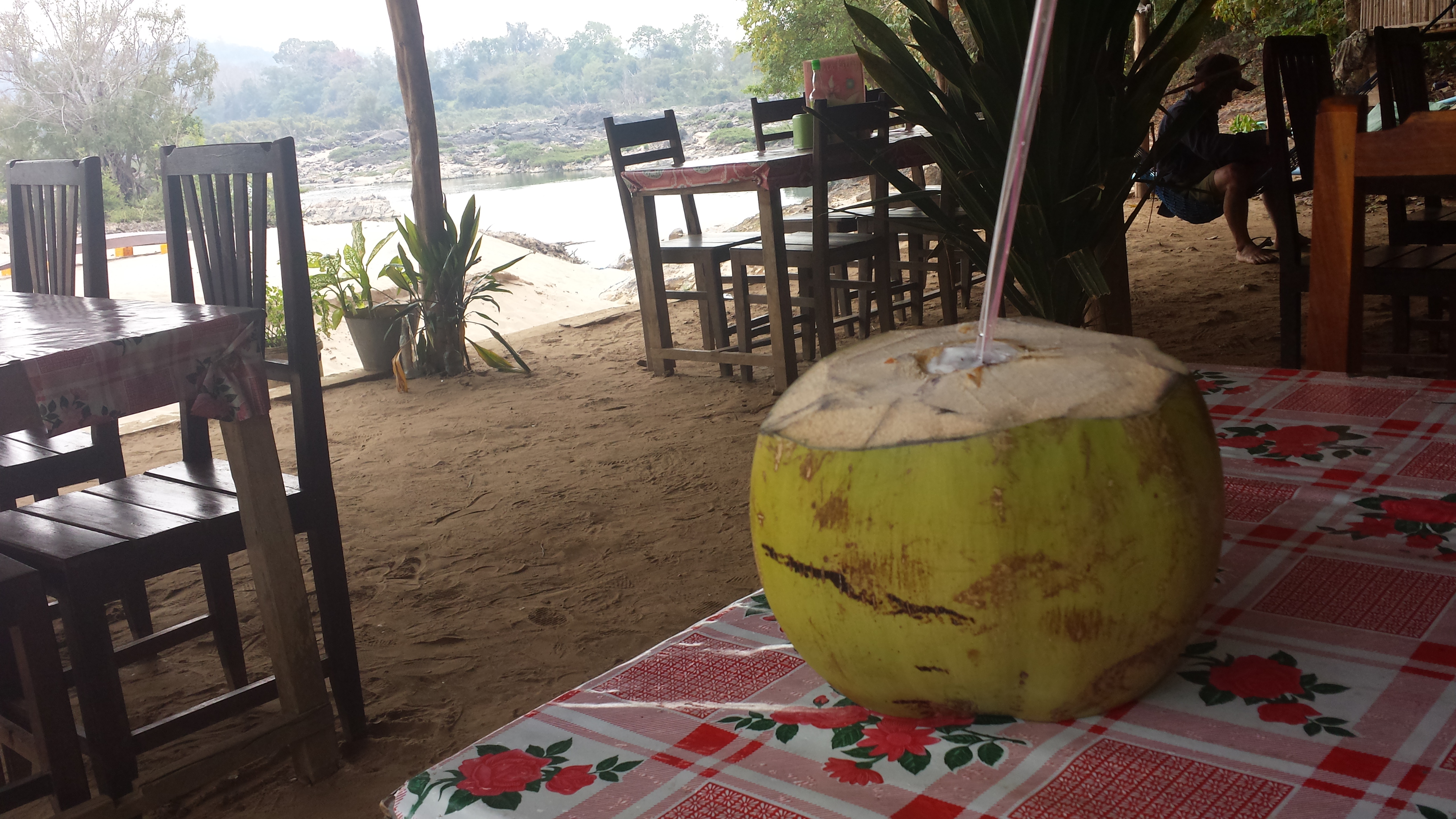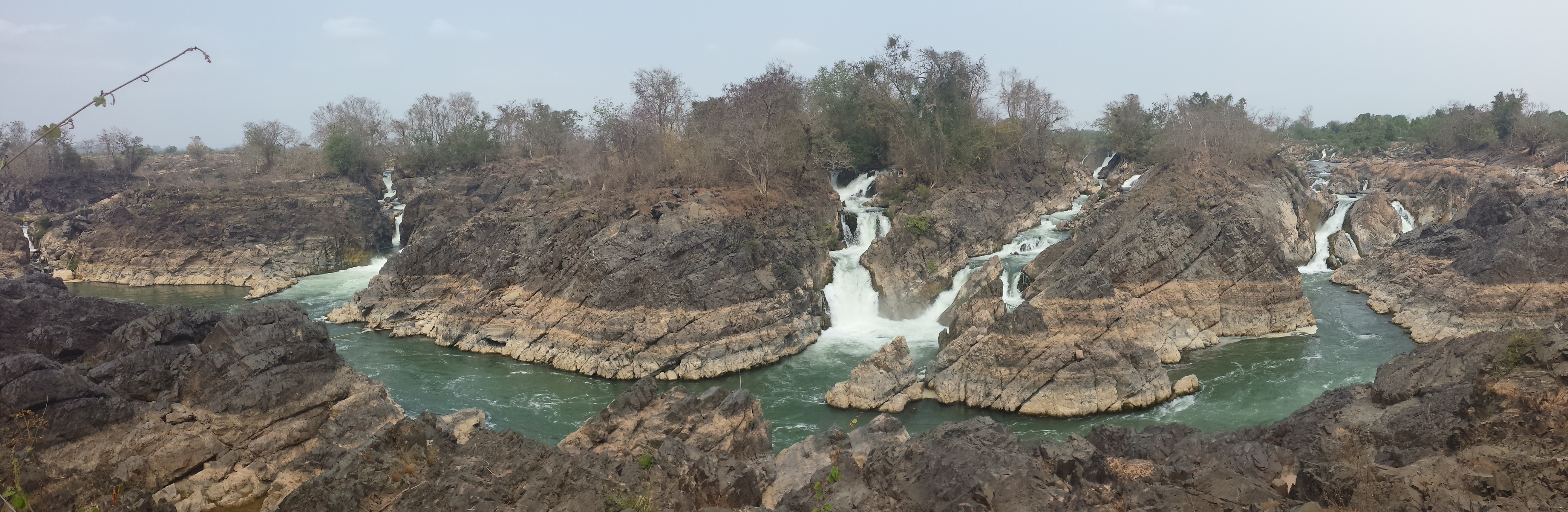 Aber zurück zum Wasserfall, bei dem es sich eigentlich um Mekong-Stromschnellen handelt. Der Mekong erreicht während der Regenzeit auf Höhe der 4000 Inseln eine Breite von sagenhaften 14 km! Jetzt ist absolute Trockenzeit, man mag sich also kaum vorstellen, mit welcher Gewalt und ohrenbetäubendem Getöse die Wassermassen hier durchrauschen.