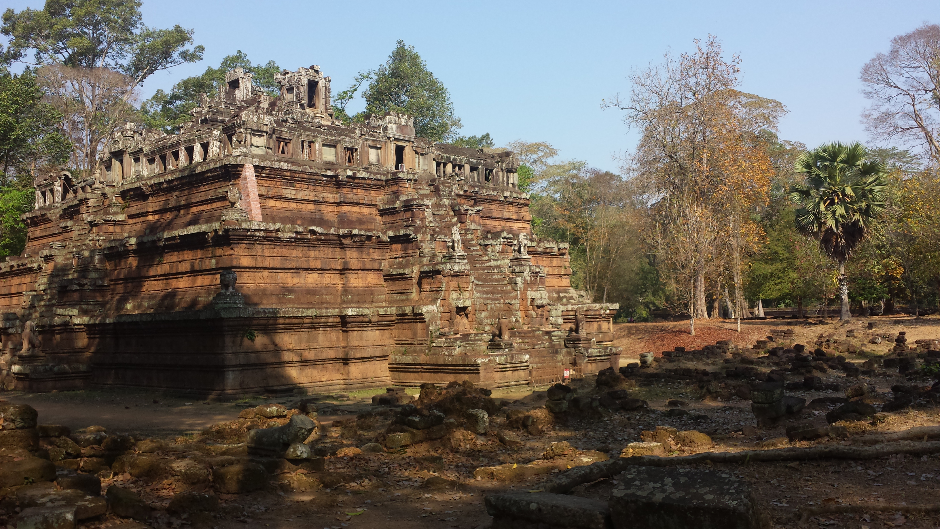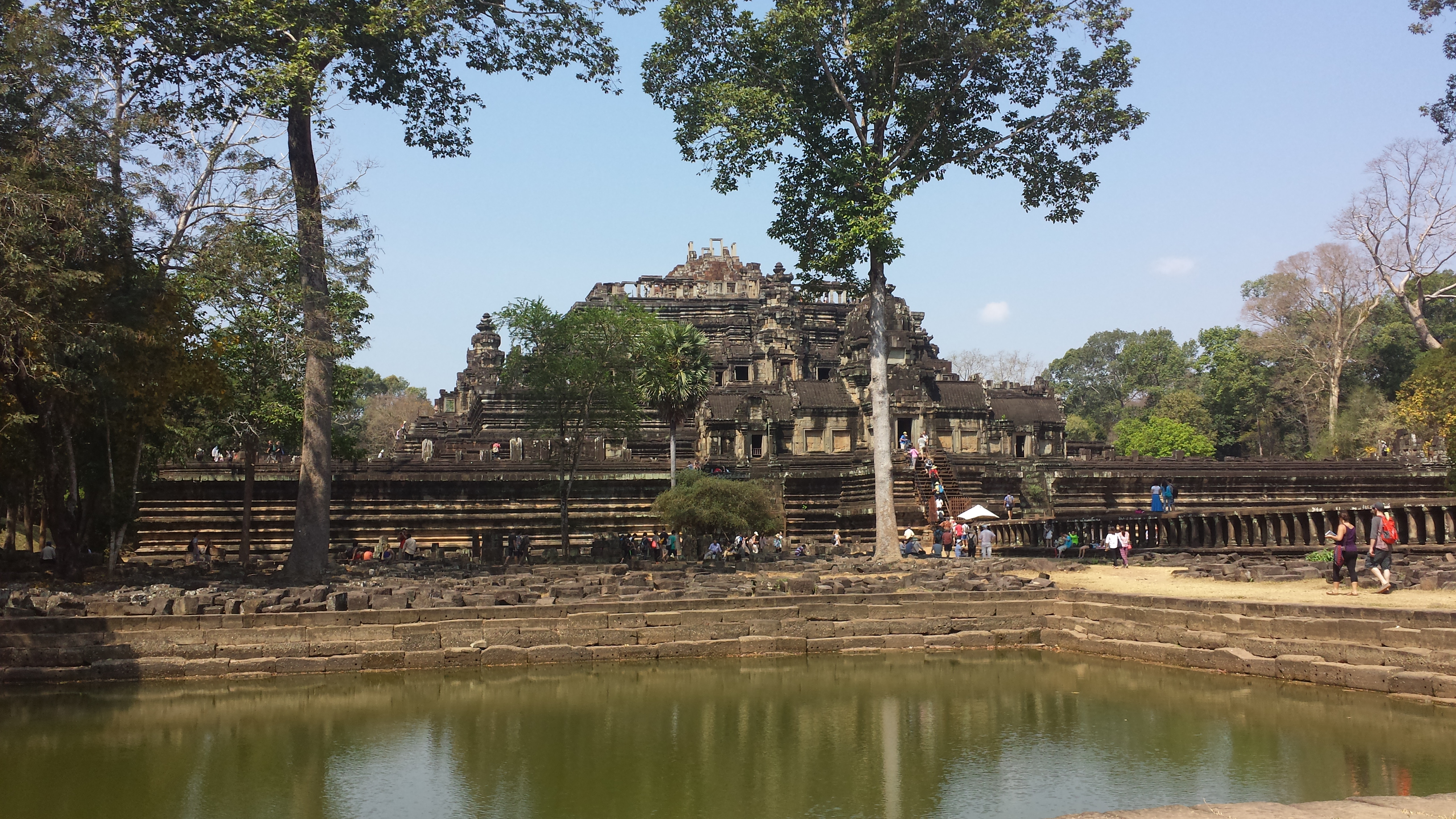 Auf Anraten meines Fahrers lassen wir den Tempel von Angkor Wat in den frühen Morgenstunden links liegen und begeben uns, mit dem Strom der Tuk-Tuks, Busse und Minibusse zur Tempelanlage Angkor Thom mit großer Elefantenterrasse, Wasserbecken und dem zentralen Tempel: