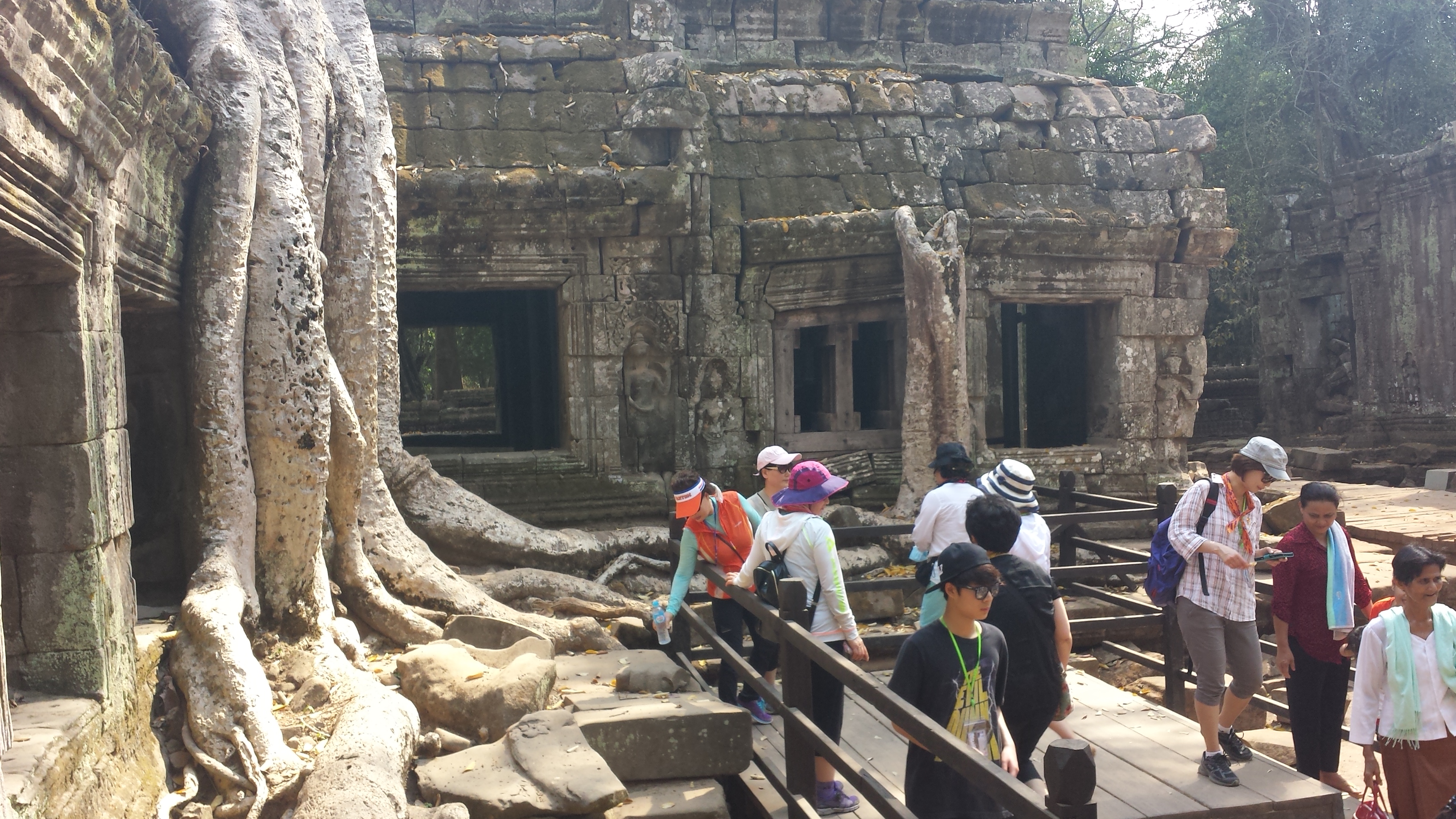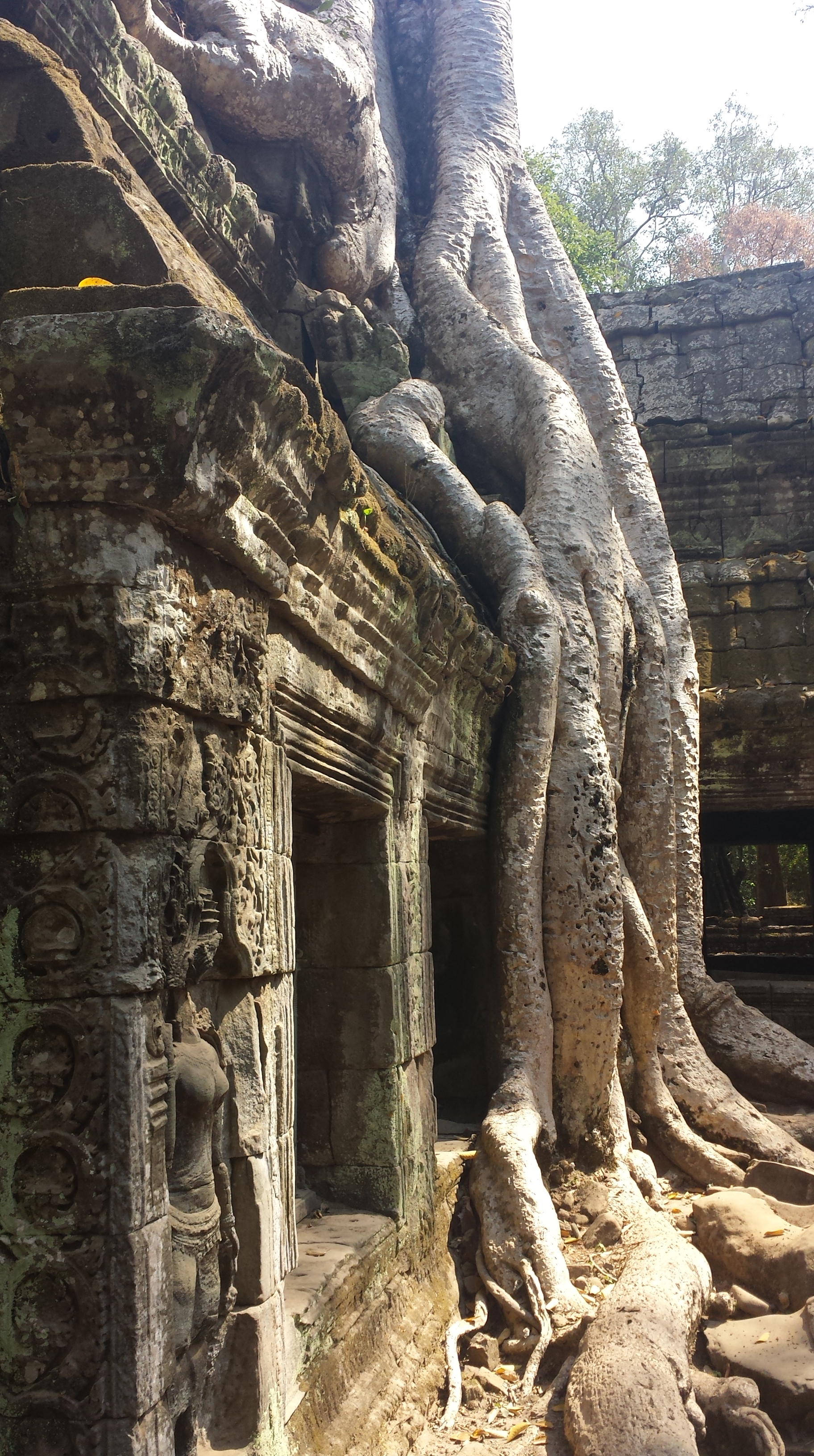 Nach kurzem Stopp für den Kauf von zwei Ananas von den penetrant aufdringlichen Händlern (ich kaufe generell bei dem, der am wenigstens rumschreit und nervt), geht es  weiter zum Dschungeltempel Ta Prohm. Der hat sicher seinem Namen in früheren Jahren auch mehr Ehre gemacht. Im Zwiespalt zwischen Restaurierung der Gemäuer und Erhalt der mächtigen Bäume wird wohl irgendwann einer den Kürzeren ziehen. Im Lonely Planet als stimmungsvollste Ruine beschrieben, verliert auch dieser Schauplatz (Tomb Raider mit Angelina Jolie) wie so viele im touristischen  Alltag doch sehr an Faszination.