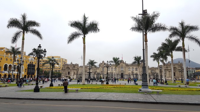 Obwohl hier viele mächtige und prächtige Bauwerke versammelt sind, strahlt der Platz eine fröhliche Leichtigkeit aus. Die große freie Fläche zum Flanieren, die Palmen und die Herrenhäuser in Limas Stadtfarbe Gelb lassen einem auch bei winterlich bedecktem Himmel warm ums Herz werden.