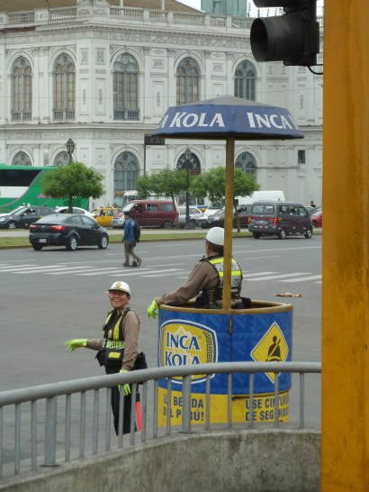 So früh auf den Beinen, kann ich gemütlich durchs sonntagmorgendliche Lima schlendern. Und schon gleich bin ich froh, an einem Wochenende hier gelandet zu sein. Das Straßenüberqueren ist selbst bei leichtem Verkehr ein bisschen wie Russisch Roulette. Auch schön, die stark vertretene Verkehrspolizei in kleidsamem Gelb in gelber Inka Cola Dose.