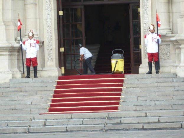 Kaum konnte ich die Szene in Pixel festhalten, werde ich von einem netten Sicherheitsbeamten gebeten, die Straßenseite zu wechseln. Polizei und Wachpersonal läuft auf. Was ist denn da im Busch? Kommt der Präsident Pedro Pablo Kuczynski gerade vom Feiern heim oder ein Staatsbesuch an?! Nein, ich habe zufällig die Gelegenheit, einem ganz besonderen Wachwechsel-Zeremoniell beizuwohnen.