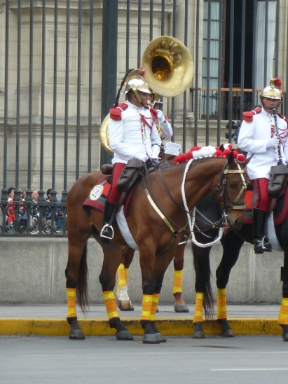 Über eine Stunde spielt die berittene Kapelle und reitet Formationen. Über Geschmack und die Musikauswahl lässt sich bekanntlich streiten. Ich meine bei den Peruaner in einigen Bereichen einen leichten Hang zu Kitsch und Theatralik zu erkennen. Präsident und Gattin schauen dem Schauspiel derweil vom frisch gesaugten roten Teppich zu.