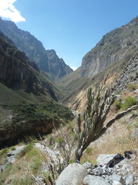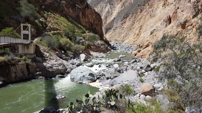 Nach knapp drei Stunden und tausend Fotos bin ich am tiefsten Punkt im Canyon und mache erst einmal Brotzeit. Da wäre mir beim Bezahlen der Touristengebühr doch fast mein Soles-Vermögen in den Canyon weggeflogen.