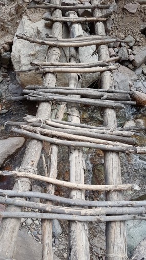 Mit offiziellem Ticket geht’s weiter nach San Juan de Chuccho. Diese kleine Holzbrücke über einen wirklich kleinen Zufluss aus den Bergen soll ich überqueren. Mein Gott, bin ich ein Schisser, mir schlockern beim Anblick schon gleich wieder die Knie. Dann doch lieber Schuhe aus und auf festem Boden durch das Gewässer. Ach, und wo ich schon mal die Schuhe aus hab – weit und breit ist niemand zu sehen – dann nutze ich doch gleich die Gelegenheit zum Gumpen-Baden! Mei, so schee wia dahoam.