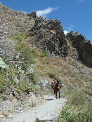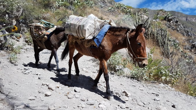 Hin und wieder kommen uns die Transport-Mulis entgegen. Zuerst begeistert, ob des tollen Fotomotivs, lerne ich bald, dass man den störrischen Viechern tunlichst ausweichen sollte … und zwar nach Möglichkeit bergseitig.