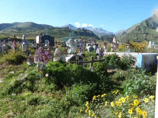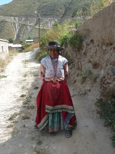 Kurz nach dem Friedhof kommt mir eine junge Belgierin entgegen. Sie hat auf dem Weg ihre Jacke samt Pass verloren. Leider habe ich sie nicht gesehen, aber wenig später wird sie fündig und schließt zu ihrer Gruppe von sechs Leuten auf. Der Weg zum Mirador ist nicht ganz einfach zu finden und natürlich in einem südamerikanischen Land nicht ausgeschildert wie bei uns daheim. Deshalb sollte man sich vorab informieren, aber die Gruppe irrt wild umeinander, ein Teil sucht rechts, ein anderer links, dabei geht der Weg geradeaus vorbei am heimischen Fußball-Stadion. Da kann ich immer nur den Kopf schütteln, wie planlos die jungen Leute losziehen. Unterwegs treffe ich sie noch zweimal. Beim ersten Mal prahlen sie, dass sie für die ganze Tour von Arequipa bis Cabanaconde einschließlich Canyon Touristengebühr (die alleine schon 70 Soles beträgt) und Übernachtung mit Frühstück 35 Soles bezahlt haben. Beim zweiten Mal sehen wie uns wieder an der Brücke im Canyon, wo sie die Touristengebühr zu löhnen haben. Tja, man kriegt halt nix geschenkt im Leben. Vermutlich sind sie einer der Organisationen aufgesessen, die keine Genehmigung zum Touristentransport haben. Hätte man sie früher erwischt, hätten sie eventuell sogar ganz umkehren müssen.