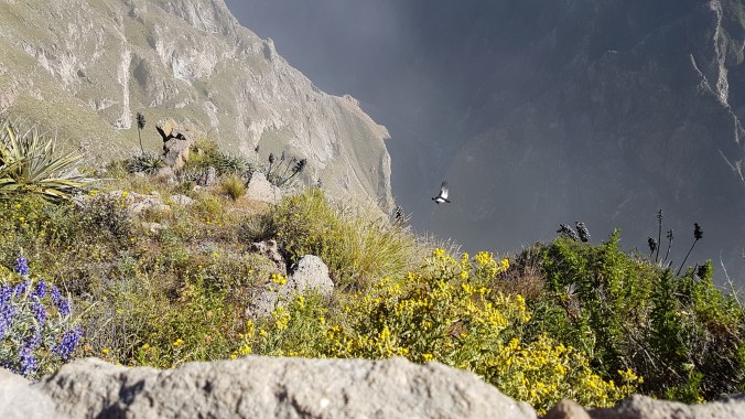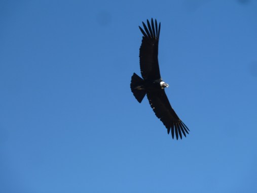 Volle zwei Stunden habe ich nun unbeschwert Zeit, von den verschiedenen Aussichtplattformen aus den Flug der Kondore zu genießen. Bei meiner Canyon-Wanderung ist mir kein großer Vogel am Himmel aufgefallen. Warum sie ausgerechnet hier so zahlreich und ausschließlich in der Zeit von 7-10 Uhr ihre Flugkünste unter Beweis stellen, weiß wohl keiner so genau. Auf jeden Fall genießen die Vögel das Dahingleiten und wir das Zusehen.