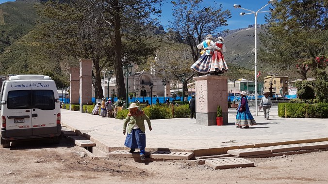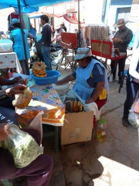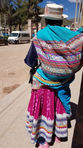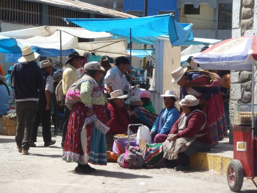 In das Touri-Restaurant muss ich jetzt nicht zum Essen rein. Da mache ich mich lieber auf den Weg in die Stadt, um mir für meine sich ausbreitende Erkältung etwas aus der Apotheke zu holen. Ach, und welch ein Glück, heute am Sonntag ist Markttag. Sensationell!! Die Farben der Trachten in dem sonst trist-staubigen Ambiente ist schlichtweg atemberaubend. Ich könnte tausend Fotos schießen, aber das mögen die andinen Volksgruppen im Hochland überhaupt nicht. Kann ich ja auch verstehen. Hier und da kaufe ich was und frage um ein Foto. Unter anderem habe ich bei diesem Tandler Lebertran gegen meine Erkältung gekauft. Das sei das Beste, meint er.