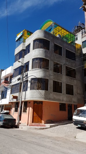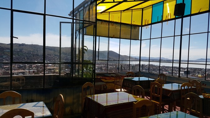 So sieht übrigens mein Hostel von außen aus  … und die meisten anderen Häuser in Puno auch. Ganz typisch sind die  abgerundenten Fenster und die bunt verglaste Dachterrasse.