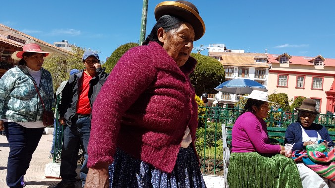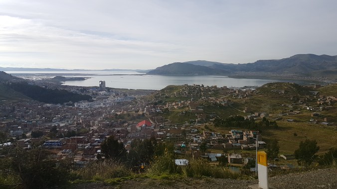 In Puno stranden wir an einem verwahrlosten Vorort-Küstenstreifen, wo Taxis auf uns warten. Eigentlich möchte ich ja um 14.30 Uhr mit einer Bus-Tour zu  dem Grabtürmen von Sillustani. Ich versuche, dies meinem Taxifahrer verständlich zu machen. Zwar gelingt mir das, aber irgendwie ist der chaotischer als ich. Die Busse starten schon um 14 Uhr an der Plaza. Das Ticket muss man aber in der Agentur kaufen. Es bleibt nur eine halbe Stunde in den vollen Straßen von Puno und zu allem Übel fehlen mir 10 Soles, um den Tour-Preis zu zahlen. Also erst Agentur, dann an der Plaza zur Bank.  Der erste ATM funtioniert nicht,  der zweite auch nicht, dann der dritte … ist doch typisch, immer wenn man es eilig hat. Die Zeit rennt dahin. Zurück zur Agentur, mit Taxi. Dort können sie dann auf den 100-Soles Schein nicht rausgeben. Es ist bereits 10 Minuten nach Abfahrtszeit. Jetzt wird es mir zu blöd. Ich verzichte dankend auf die Tour zu den Grabtürmen, auch in Anbetracht der dunklen Wolken, die am Himmel aufziehen. Witzigerweise stelle ich dann fest,  dass der Fußweg von der Agentur zu Bank und Plaza gerade mal ums Eck ist.  Also viel kürzer als meine Hin- und Herfahrerei mit dem Taxi. Ziemlich verplante Aktion.