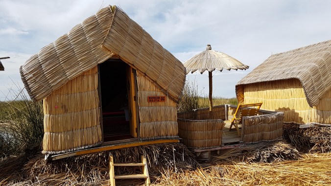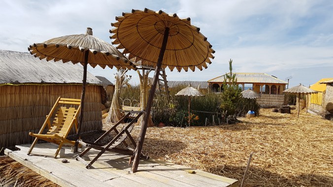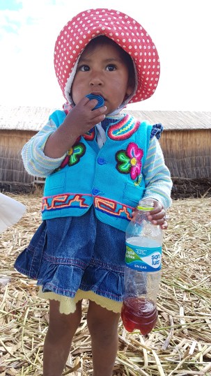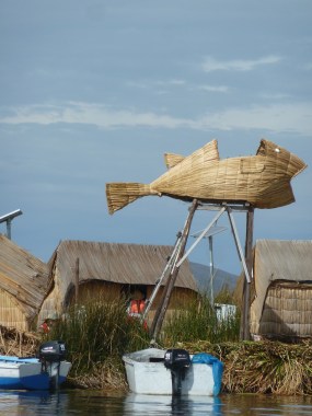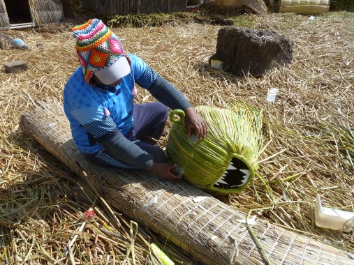 An einer winzigen Insel ohne Namen legen wir an. Bevor es an die kleinen Verkaufsstände geht, gibt es einen Vortrag für uns … ihr könnt es euch denken: in Spanisch. Ursprünglich waren die aus Totora-Schilf gebauten schwimmenden Inseln Zufluchtsorte vor den Colla- und Inka-Herrschern. Nahezu alles besteht hier aus Schilf: die Inseln, die Hütten, die Boote und das Kunsthandwerk. Selbst essen kann man einige Teile des Schilfrohres. Die Bevölkerung heute ist eine Mischung aus dem Volk der Uros und der Aymara. Die Kinder lernen Aymara und Spanisch.
