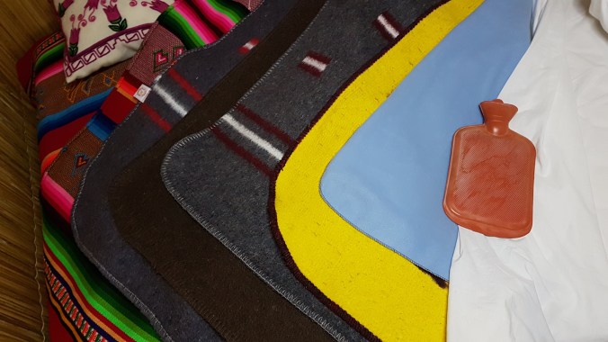 Mit der Länge der Nacht komme ich dagegen einfach nicht zurecht. Um 18 Uhr ist es bereits stockdunkel und um 6 Uhr wird es erst wieder hell. 12 Stunden Dunkelheit,  mir reichen aber 6-7 Stunden Schlaf. Da bleibt noch viel Zeit zum Wachliegen. Zusammen mit den geschlossenen Nasennebenhöhlen, der dünnen Luft und den bleischweren Alpaka-Decken (insgesamt habe ich 7 Decken!!) fühle ich mich etwas erdrückt.