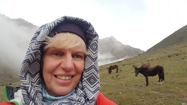 Natürlich bin ich als Erste unserer Gruppe oben am Pass und werde von unserem Küchenjungen mit einem Coca-Tee begrüßt. Inzwischen hat sich der Salkantay in Wolken verhüllt und es fängt an zu nieseln. Plötzlich haucht jemand ein erschöpftes „Andrea!“ Megan kommt – blass und elend – auch auf einem Pferd daher. Ihr geht es richtig schlecht, Übelkeit, Kopfschmerzen, Schwindel… sie muss schnellstmöglich in niedrigere Regionen absteigen. Keine Frage, ich begleite sie. Oben gibt es sowieso nichts mehr zu sehen, denn Nebelschwaden und Regenwolken umhüllen die Nevados.