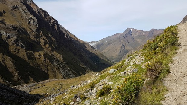 Durch ein wild-romantisches Tal steigen wir bei leichtem Regen so lange bergab bis es Megan etwas besser geht. Dort warten wir auf Brad, der in Sorge um seine Frau der Gruppe vorausgeeilt ist. Schlussendlich treffen wir uns alle in einem kleinen Weiler wieder. Die Zu-Fuß-Bezwinger sind geschafft, aber auch happy, es geschafft zu haben.