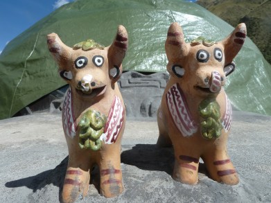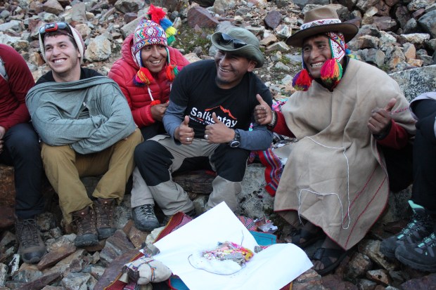 Was der Guide und der Schamane dann so von sich geben, kann ich mir aufgrund der in mir aufsteigenden Kälte, dem fiebrigen Frösteln und der in mir aufkeimenden Wut nicht alles merken. Coca-Blätter werden verteilt und begleitet mit Fürbitten an die Berggötter  gen Himmel gehoben und ein kunterbunter Opfertisch für Pachamama bereitet. In meinen atheistischen Ohren klingt das alles einfach nur nach großem Mist. Ist ja schön, wenn man Mutter Erde, den Berggöttern und der Natur huldigt, Respekt und Dankbarkeit zollt, aber der Kitsch an Zuckerperlen und neumodischem Zeugs, welches der Schamane in aller Seelenruhe aus Tütchen und Zeitungspapier entpackt, hat doch wirklich nichts mit Tradition und Nähe zur Natur zu tun.