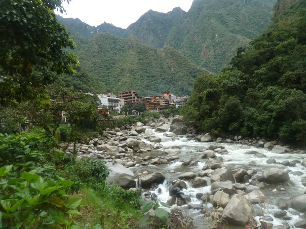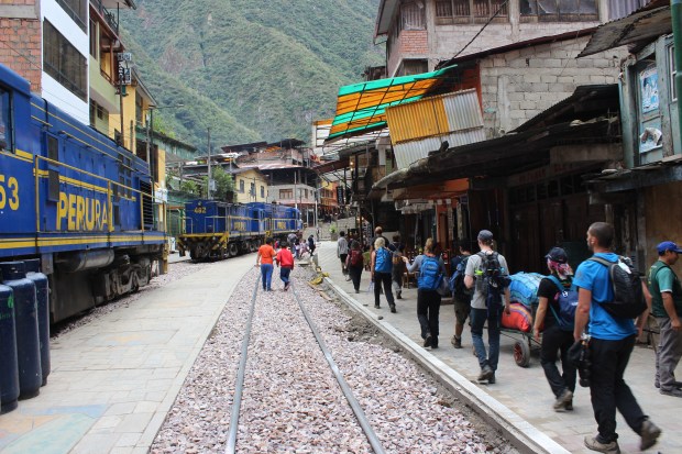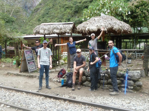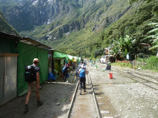 Nach 3 Stunden Gleis-Wandern laufen wir um 14 Uhr in Machu Picchu Pueblo ein, ein Ort, der ganz allein vom Tourismus lebt. Entweder wohnt man hier am Fluss oder direkt an der Bahnstrecke. Die seltenen Züge fahren praktisch am Restauranttisch vorbei, wenn man es sich draußen gemütlich macht.