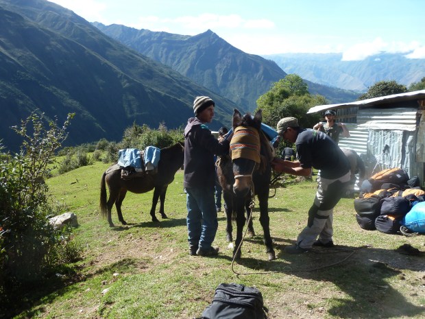Weitere zwei Fahrtstunden später spuckt uns das motorisierte Gefährt samt unserer kompletten Ausrüstung für Verpflegung und Übernachtung während des Treks in Challacancha, dem Startpunkt unserer muskelbetriebenen Fortbewegung, aus. Hier wartet auch schon unser Horseman Luis mit seinen Mulis, um unsere Duffle Bags, Schlafsäcke, Matten, Zelte, Koch- und Essgeschirr, Essensvorräte etc. auf den Galoppern zu verstauen.