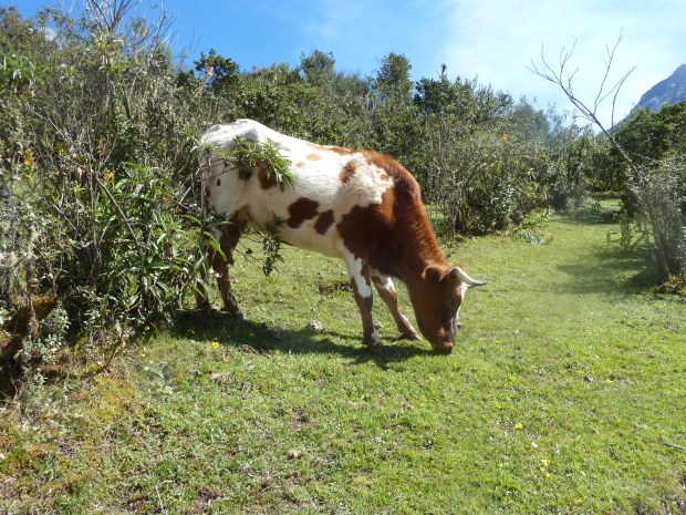 Na, dann mal auf zum ersten kurzen Testanstieg von 3350 auf 3850 m. Den mächtigen Apu Humantay mit seinen weißen Schneemützen haben wir dabei stets fest im Blick. Und schöne Kühe und Blumen gibt es hier in Peru auch, Friedl 😉
