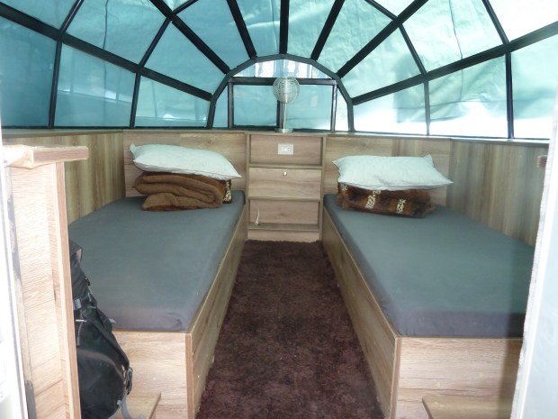 Auch die Innenausstattung ist eine Schau und für mich zur Alleinnutzung ist mehr als ausreichend Platz vorhanden. Einzig mit dem tunnelartigen, niedrigen Eingang kann ich mich nicht anfreunden. Gleich drei-, viermal verschätze ich mich in der Länge der Unterführung und haue mir ziemlich heftig den eh schon höhenbedingt geplagten Kopf an. AUA!! Leider helfen da auch die zwei glücksbringenden Rindviecher auf dem Dach nicht weiter.
