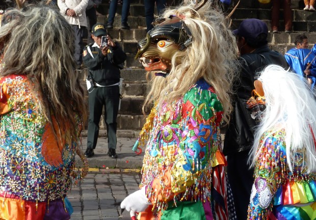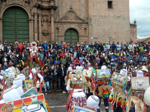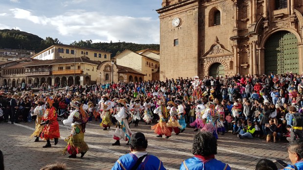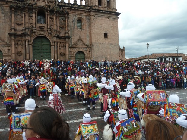 Erst am Sonntag, den 21. Mai, ergibt sich aus dem allabendlichen Sportprogramm ein ganz anderer Sinn. Da habe ich nämlich die Gelegenheit, eines der zahlreichen, bunten Feste in Peru live und hautnah zu erleben. Zwar kann ich trotz intensiver Recherchen nicht herausfinden, um welche Feierlichkeit es sich genau handelt, aber ich gehe schwer davon aus, dass es sich dabei – ähnlich wie in Paucartambo – um eine Mischung aus Karneval und religiöser Anbetung einer Jungfrau handelt. Nachdem das Zeremoniell vor der Kathedrale von Cusco stattfindet, ist es eventuell La Virgen de la Asunción de Cusco, der heute diese Ehre widerfährt.