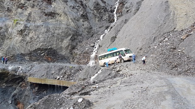 Ziemlich bald nach Paucartambo endet die ausgebaute Teerstraße und der blau-weiße Wolkenhimmel weicht schweren, grauen Wolken. Über den Acjanacu-Pass (3850 m), dem Tor zum Manu Nationalpark, schunkelt unser Bus den holprigen Schotterweg entlang, umfährt Schlaglöcher, schlängelt sich Serpentinen hinab, streift haarscharf an entgegenkommenden Minibussen vorbei und … wird schließlich von einem großen Erdrutsch gestoppt, der die „Straße“ unpassierbar macht.