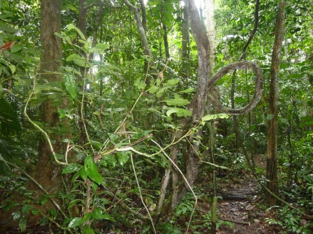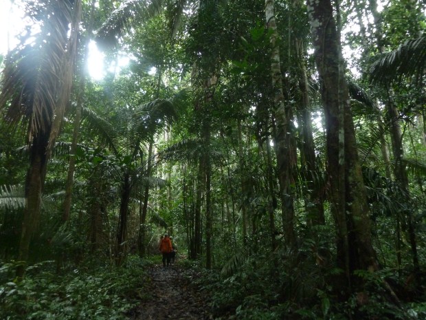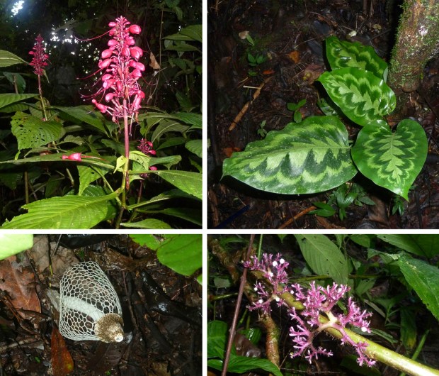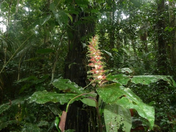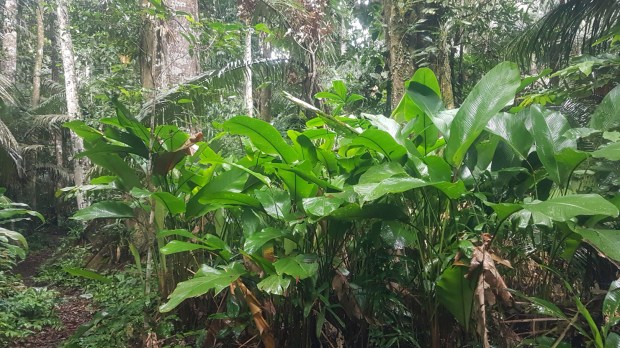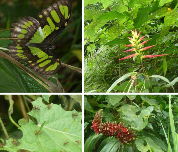 Auf der anderen Seite des Flusses führt uns ein Forstweg schon bald wieder in die leuchtend grüne, undurchdringliche Natur des Regenwaldes. Riesige Blätter in allen Formen strecken sich uns entgegen, Helikonen setzen bunte Farbtupfer ins Grün, genau wie die großen Schmetterlinge. Aber auch den kleinen Krabbelviechern schenken wir Beachtung und bewundern ihr Aussehen und ihre Leistung.