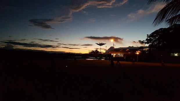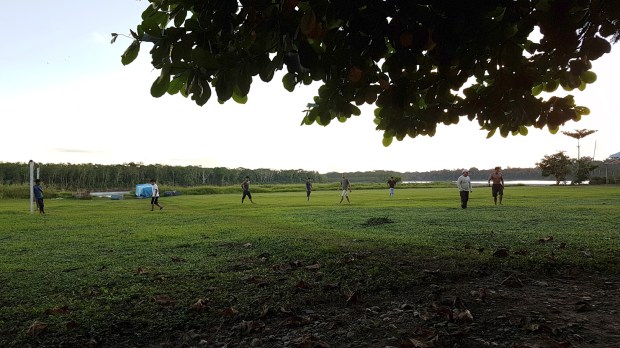 Nachdem wir in Boca Manu wieder unsere Zimmer bezogen und geduscht haben, treffen wir uns im „City Center“ auf ein „Bierchen“. An den hier vorrätigen 1100 ml Flaschen kann selbst ein Bayer nichts zu bemängeln haben. Auf dem Fußballplatz tobt derweil ein ambitioniertes Spiel. Egal ob Einheimische, Guides, Köche, Bootsführer oder Touristen … sobald genug Leute da sein, beginnt das Match. Es ist köstlich dabei zuzusehen, wie sie über den Wiesenacker wetzen, mit Sandalen, richtigen Fußballschuhe oder auch barfuß, immer wieder umknicken oder hinfallen. Vom Dorf kommen neue Spieler stolz mit ihren eigenen Fußballschuhen, die sie in der Hand halten wie einen Schatz. Wenn die Zahl stimmt, werden die Mannschaften aufgestockt. Nur die kleinen Burschen schauen betrübt. Gerne würden sie auch mitmischen, aber sie sind den anderen wohl noch zu jung. Wir haben unsere helle Freude und feuern unser Team an. Es ist schon dunkel, als unser Koch vom Fußballplatz durch die Dusche an den Herd hetzt. Hatte ich eigentlich schon erwähnt, dass in Peru jede Ansiedlung ab zwei Personen einen eigenen Fußballplatz unterhält?!