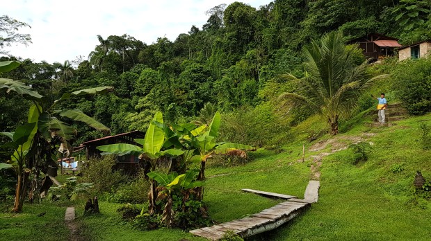 Inzwischen hat es regenwaldtypisch angefangen heftigst zu regnen. Immer wieder freue ich mich über meine sicher und trocken verpackten Füße in den Gummistiefeln. Zusammen mit Regenhose und Regenjacke kann mir das warme Nass von oben und unten nichts anhaben. So eingemümmelt erreichen wir die Matsiguenka Lodge. Diese Lodge wurde von der indigenen Bevölkerungsgruppe der Matsiguenka erbaut und wird von ihnen auch eigenständig geführt. Sie ist um einiges größer als unser kleines Camp im Urwald. Aber auch hier ist in der Vorsaison noch nichts los. So machen wir nur eine kleine Pause für unser Mittagessen aus der Tupperdose, bevor wir den Marsch zurück zum Boot und die „Heimfahrt“ antreten.