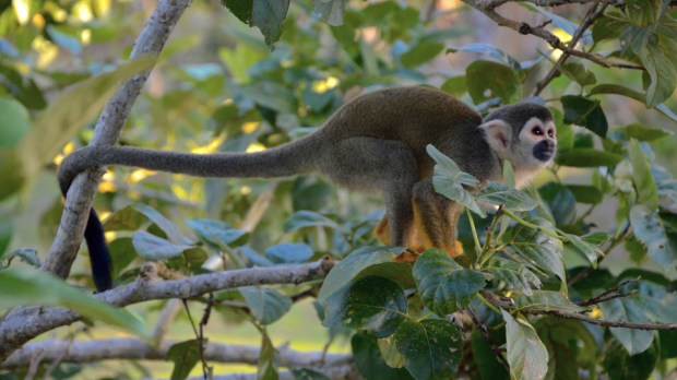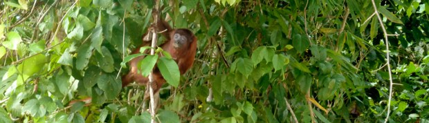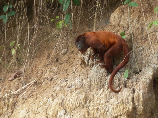 Nachdem wir uns in Limonal offiziell zum Besuch der Reserved Zone angemeldet haben, geht es weiter auf Entdeckungstour. Alle im Boot spotten mit und auch Koch und Kapitän freuen sich wie kleine Kinder, wenn sie etwas ausgemacht haben. Eine Herde Totenkopf-Äffchen streift direkt am Ufer von Strauch zu Strauch, dort oben sitzen Rote Brüllaffen im Geäst und beäugen uns, ein Ara-Pärchen macht Pause im oberen Stock – ihre Farbenpracht ist phänomenal: mal in rot-blau, dann in gelb-türkis oder die bunte Scarlet-Version.