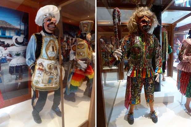 In Paucartambo (2906 m) ist Marktsonntag. Mir scheint, jetzt, zu Anfang der Saison, werden wir wenigen Touristen noch skeptisch beäugt. Das ändert sich spätestens Mitte Juli, wenn Paucartambo aus allen Nähten platzt. Dann findet nämlich in diesem kleinen, verschlafenen Städtchen das aufwändigste und farbenprächtigste Spektakel statt, das man sich vorstellen kann. Das Festival zu Ehren der Virgen del Carmen. Ebenselbige heilige Jungfrau Carmen wurde 1985 von „unserem“ Papst Johannes Paul II – der im Übrigen selbst zu den Heiligen zählt – heilig gesprochen. Das muss gefeiert werden! Mit bunten, phantasievollen Kostümen, mit viel Musik und Tanz und auch mit recht viel Alkohol, wenn man den Berichten glauben darf. Hier laufen also alle die Tanzgruppen wieder auf, die ich gestern in Cusco bestaunen konnte – und wohl noch viel mehr. Am auffälligsten und lautesten ist dabei die Gruppe der Teufelstänzer (Danza Saqra de Paucartambo). Ihre dämonischen Tiermasken mit Hörnern, Geweihen, fletschenden Zähnen und die zotteligen Haare und überlangen Fingernägeln sind wahrhaft furchteinflößend. Aber die Gesellen wollen alles andere als Angst einjagen, sondern besteigen während der heiligen Prozession in Paucartambo Dächer und Balkone, um die Virgin del Carmen zu verführen und die Besucher des Festivals schelmisch auszutricksen und zum Lachen zu bringen. Hört sich nach sehr viel Spaß an drei Tagen im Juli. Außerhalb dieser Zeit ist in Paucatambo aber der Hund begraben und wir begnügen uns mit einem Rundgang durch das kleine Heimatmuseum, wo auch Kostüme und Masken ausgestellt sind und die Geschichte der Region recht modern und interessant dargestellt wird.