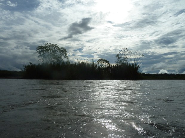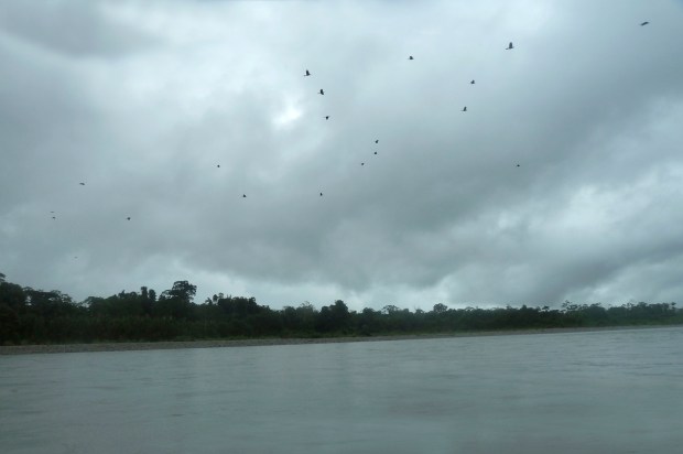 Die ersten Stunden der Fahrt sind ganz schön feucht und frisch. Das hat man davon, wenn man nur mit drei Touristen an Bord ist und in der ersten Reihe sitzen will. Fahrtwind, Gischt und Regen peitschen uns ins Gesicht. Aber je weiter wir von den Berghängen der Anden wegkommen, um so luftiger wird die Wolkendecke und schließlich lässt sich sogar die Sonne blicken. Wir lassen grün wuchernden Flussufer, großzügige Kiesbänke, feinsandige Strände und Schwemmholz-Kunstwerke links und rechts an uns vorbeigleiten. Immer wieder sehen wir verschiedenste Reiherarten, Störche, Schwalben, Schuhschnabler und allerhand andere Wasservögel von üblichen Enten bis hin zu besonderen Arten wie dieser hier: