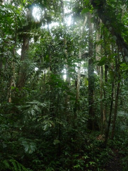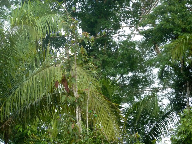 Dann plötzlich spottet Juan-Carlos „im Vorbeifahren“ die ersten Wollaffen im dichten Blattwerk. Also, alles raus aus dem Bus und zum ersten Mal das Fernglas im Einsatz. Alle haben die wirklich großen, schwarzen und flauschig-felligen Woolly Monkeys schon entdeckt, nur ich blindes Huhn stiere ins Leere bzw. ins Grüne. Aber da, ja, jetzt hab ich sie auch im Visier!! Meine Begleiter haben schon die Handys und Kameras gezückt, aber in Anbetracht der doch eher mäßigen Erfolgsaussichten, einen dieser rasanten Kletterkünstler scharf vor die Linse zu bekommen, werde ich mich die nächsten Tage wohl eher aufs Schauen und Beobachten konzentrieren, denn aufs Fokussieren. Ich bin ja schon froh, wenn ich mit dem Fernglas „hinterherkomme“ 🙂