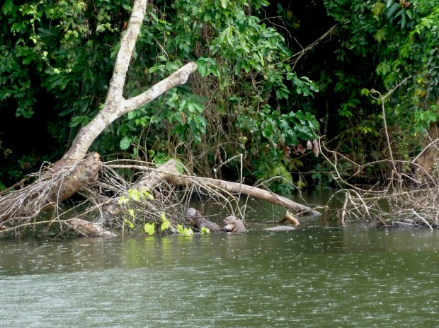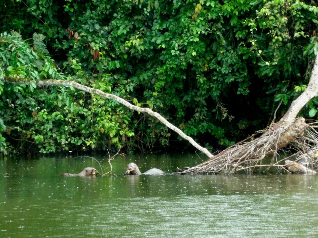 Gemächlich paddeln uns unsere Jungs über den wunderbar ruhigen Salvador See und dann ist es unser Koch, der vom Ufer aus die Riesenotter-Familie entdeckt. Laut quiekend durchstreifen sie den See beim Fischfang. Wir paddeln vorsichtig näher ran, doch ein Abstand von 20 m müssen die Guides einhalten, sonst könnte ihrer Touragentur die Lizenz für die Reserved Zone entzogen werden. Kein Problem ist es aber, wenn die Riesenotter wie in unserem Fall neugierig auf uns zuschwimmen. Ach, ist das aufregend! So quirlig, flink und aufgeregt pflügen sie durch das Wasser, aber gegessen wir im Schutz von Zweigen und Ästen in Ufernähe. Andernfalls würde ihnen ihre Beute von Piranhas und anderen Raubfischen streitig gemacht werden. Wir haben lange Zeit, sie zu beobachten, bevor sie sich nach der Mahlzeit in einen anderen Teil des Sees verziehen. Rundum zufrieden, paddeln wir zum Steg zurück und bekommen dabei auch noch den seltsamen Hoatzin (Schopfhuhn oder Zigeunerhuhn) im Uferdickicht zu sehen.