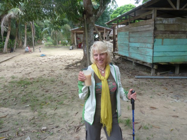 Die erste Tagesetappe unserer langen Heimfahrt flußaufwärts bringt uns zur Paititi Lodge. Unterwegs besuchen wir ganz spontan das Dorf unseres Bootsführers Cesar. Etwas schockiert bin ich schon über die hiesigen Verhältnisse. Alle hängen hier rum, lausen sich gegenseitig und trinken so ein gäriges Gesöff aus zerkauter und in Spucke vergorener Yucca (Maniok). Wie es der Teufel will, werden wir just zu diesem lokalen Spezial-Getränk eingeladen. Juan-Carlos beschwichtigt uns, dass heutzutage angeblich nicht mehr in den Yucca-Brei reingespuckt würde, um den Gärprozess in Gang zu bringen, und natürlich besteht er darauf, dass wir den riesigen Becher nun wohl oder übel leeren müssen, weil das sonst ein Affront gegen die großzügige Einladung sei. Wir tun unser Bestes, aber ich muss gestehen, dass Juan-Carlos wirklich den Löwenanteil an dem Gesöff übernommen hat. Leicht irritiert verlassen wir diese Lokalität.