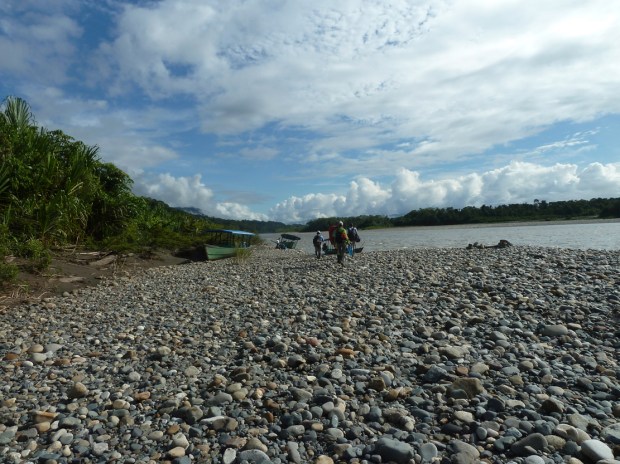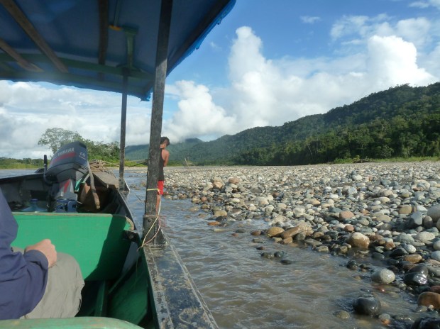 Für Aaron, Hannah (Denver/USA) und mich geht es weiter den Alto Madre de Dios hinab. Schnell zeigt es sich, wie unerlässlich das Wissen und die lange Erfahrung der heimischen Bootsführer ist. Das Kies- und Gesteinsbett des Alto Madre de Dios verändert sich ständig, mitgeschwemmtes Treibgut in allen Größen tut sein Übriges, und unserer Bootsführer muss stehts konzentriert steuern, um die richtigen Passagen mit ausreichend Wasser unterm Boot zu erwischen. Aufregend, wie das Gestein unterm Kiel durchrauscht.