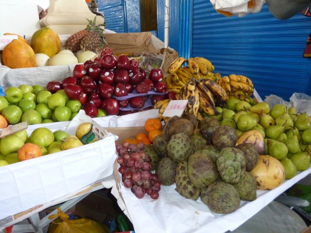 Unbedingt probieren muss ich noch die Chirimoja-Frucht, die wurde mir schon mehrfach empfohlen. Also wandert ein besonders schönes Exemplar (im Bild vorne) in meinen Rucksack und ein leckerer Fruchtshake in meinen Bauch.