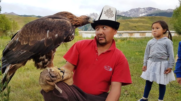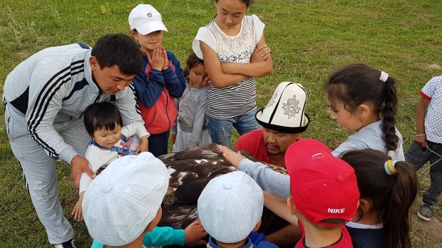 Der junge Adler wiegt 6 kg, der große, Ojmok, Champion der World Nomad Games, stolze 9 kg. Aman mit seiner Zahngold-Front ist auf jeden Fall super nett, nimmt sich sehr viel Zeit für uns und beantwortet uns stolz jede gestellte Frage. Unter anderem erfahren wir, dass die Adler die 5-stündige Fahrt nach Cholpon-Ata zu den World Nomad Games doch tatsächlich einfach als Passagier im Taxi oder Privatauto unternehmen. Aizhamal hat es selbst einmal erlebt, das Taxi mit einem käfiglosen Adler zu teilen. Später gesellt sich noch eine ganze Kinderschar von einem Fest in der Nachbarschaft zu uns. Auch hier bleibt der große Raubvogel völlig relaxt und lässt sich von einer Traube von Kinderhänden anfassen. Ein wirklich tolles Erlebnis!