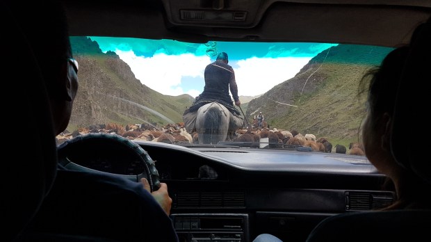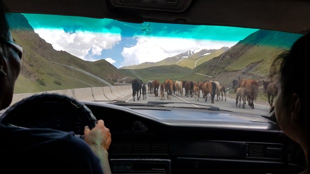 Die Landschaft ist toll, Hügel und Berge in allen Farben und Schattierungen sausen links und rechts der bestens asphaltierten Straße nach Süden vorbei und rücken am Dolon-Pass immer näher zusammen. Pferde und Kühe ziehen hier und da ihrer Wege auf dem warmen Asphalt – wollen sie auch nach Naryn?! Dann wird unsere schnelle Fahrt, für die der Tachozeiger nur schlappe 20 km/h bei 3000 Umdrehungen anzeigt, jäh gestoppt und wir stehen in einem animalischen Stau.