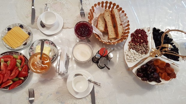 Die Sprachbarriere ist wieder groß. Wir können uns verständigen, dass wir – der Einfachheit und Schnelligkeit wegen – Mantis (gefüllte Maultaschen) essen. Auf die Frage „Wie viele?“ antworten wir mit „4 for me, 4 for her“. Macht nach Adam-Riese 8 zusammen. Dauert nur 5 Minuten meint die Dame engagiert … kirgisische 5 Minuten sind lang, aber wie lang?