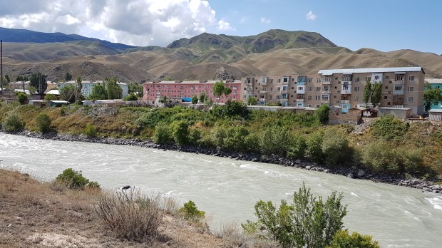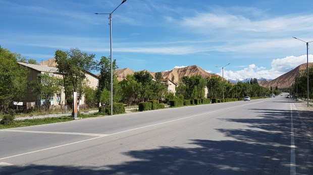 Verwundert nehmen wir Guliras Angebot an, uns zur Bank zu fahren, und erfahren dabei, dass sich der Ort Naryn über mehrere km an einer Straße entlang ausdehnt. Es gibt also keine Seitenstraßen, nur die Hauptstraße und den gleichnamigen Fluss. Was es auch nicht gibt, sind Dollar an den drei ATMs unserer Wahl.