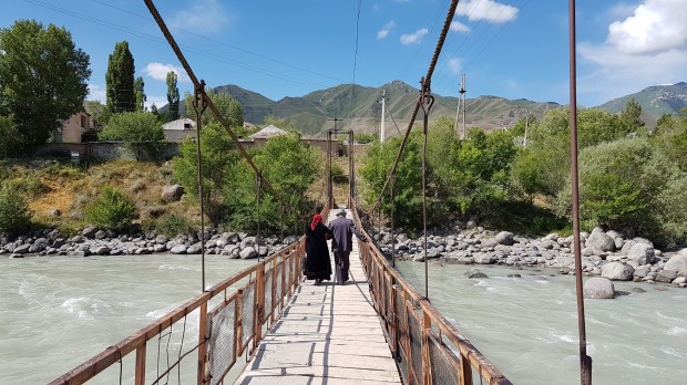 Immer mit Blick auf die heruntergekommenen Sowjet-Wohnblöcke der 70er Jahre, schlendern wir über die Hängebrücken in die Stadt.