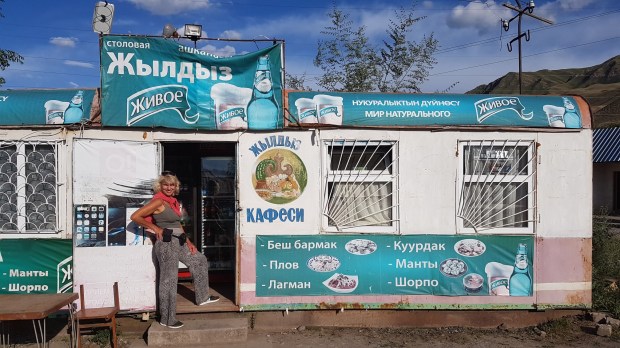 Gegen Abend haben wir mit Gulira noch den Besuch einer „Eagle Hunting Show“ in der Nähe von Naryn vereinbart. Deshalb bereiten wir im Guesthouse schon mal unser Gepäck für den bevorstehenden 3-Tages-Trip vor. Ach ja, und etwas Warmes essen sollten wir ja vielleicht auch noch, wenigstens einmal am Tag. Um 18.45 Uhr sollen wir beim Office sein, um zum Eagle Hunter zu fahren. Da bleibt nicht mehr viel Zeit, also entschließen Lea und ich uns kurzerhand für ein Take-away auf die Hand. Leider fällt auch hier die Auswahl nicht leicht, irgendwie schaut alles so schäbig und „mitgenommen“ aus. Im ersten Imbisswagen bequemt sich das junge Ding fast noch nicht einmal zum Aufstehen, das blöde Geschau dazu lässt unsere Hoffnung sinken, in diesem Schuppen noch irgendetwas Nahrhaftes zu bekommen. Auf zum Nachbar-Laden, wo zwei junge Frauen wohl wenigstens noch ein minimales Interesse daran haben, etwas zu verkaufen.