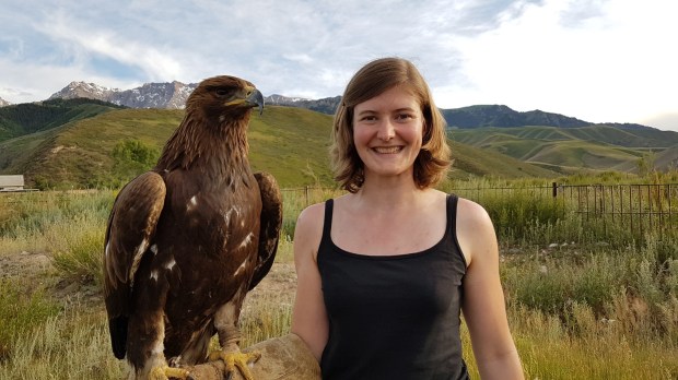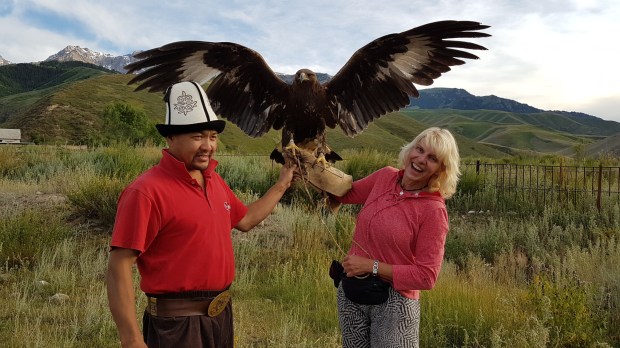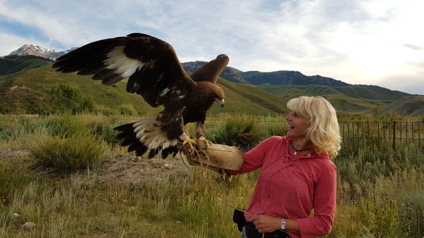 Um 18 Uhr fahren wir dann mit Aizhamal vom CBT-Office vor die Tore Naryns zu Aman und seinen beiden Adlern. Die Unterkunft der prächtigen Vögel in einem dunklen, niedrigen Stall schockiert uns zuerst einmal. Wir sind deshalb  froh, dass wir mit den Vögeln nach draußen gehen und … sie selbst halten dürfen. Boah, welch ein Gefühl, diesen Tieren so nah zu sein, in die Augen zu schauen und dabei das Vertrauen zu haben, dass sie ihren Schnabel und ihre Krallen nicht zum Einsatz bringen.