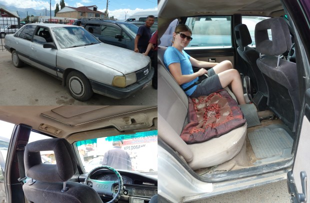 Nach dem Abstieg vom wunderschönen Köl Ükök soll es von Kochkor (1800 m) gleich weitergehen nach Naryn (2050 m). Die deutschsprechende Aishan aus dem Supermarkt in Kochkor freut sich, uns noch einmal zu sehen und organisiert uns an der wuseligen, männerdominierten Station ein Sammeltaxi. Angesichts unseres Gepäcks steigt der Transportpreis gleich mal von üblichen 200 auf 300 SOM. Schon beim Einsteigen bedauern wir, die Fahrzeugauswahl nicht selbst getroffen zu haben. Die Audi-Schrottkiste sieht nicht nur äußerlich völlig ramponiert aus, sie kann auch nicht mit „inneren Werten“ glänzen.