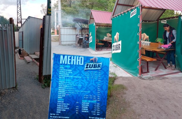 Nach einer erfrischenden Dusche machen wir uns wieder auf den Weg in die Stadt zum Abendessen. Verlaufen kann man sich hier auf jeden Fall nicht. Von außen betrachtet eher an Blumsklohäusel oder Baustellenabsperrungen erinnernd, soll das Schaschlik-Restaurant hier wohl nicht schlecht sein.