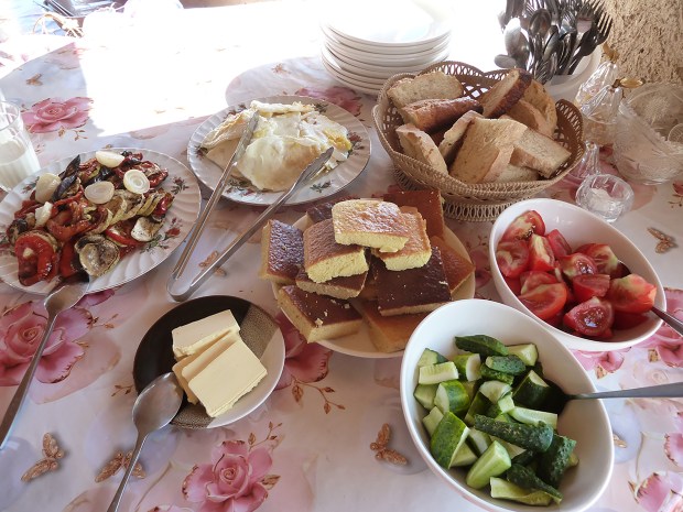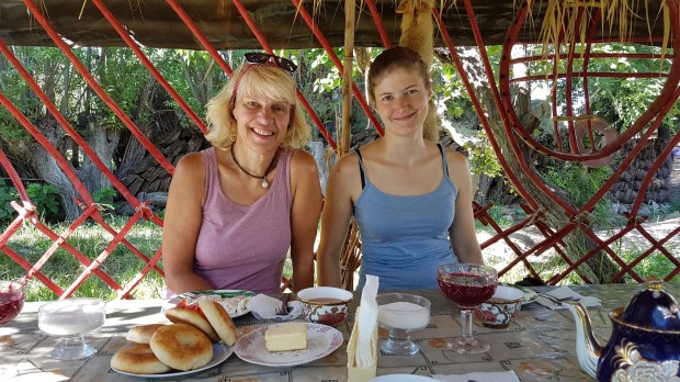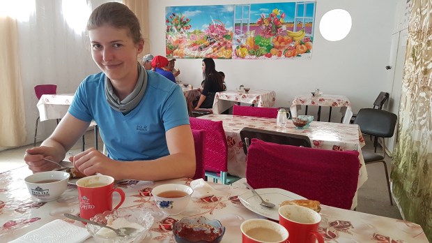 Tief und fest haben wir geschlafen in unserer kleinen Familien-Pension in Kyzyl Tuu. Es ist bereits 8 Uhr und auf uns wartet in der Gartenlaube schon das Frühstück – und Elnura.