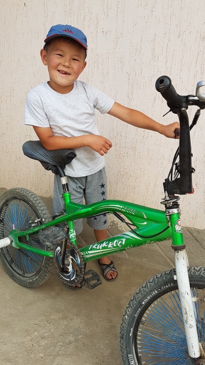 In aller Eile klauben Lea und ich unsere Wäschestücke von der Leine, stopfen unser Hab und Gut in den Rucksack und hoffen insgeheim, dass wir bei unserem Blitzstart nichts hängen, stecken oder liegen gelassen haben. Um halb 10 kann’s dann mit uns und Elmurat auf der Rückbank los gehen. Sogar für einen Schnappschuss mit seinem grünen Radl hat es noch gereicht. Und er staunt Bauklötze, als ich das Foto auf meinem kleinen Hosentaschen-Printer für ihn ausdrucke.
