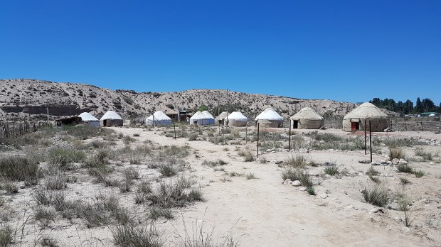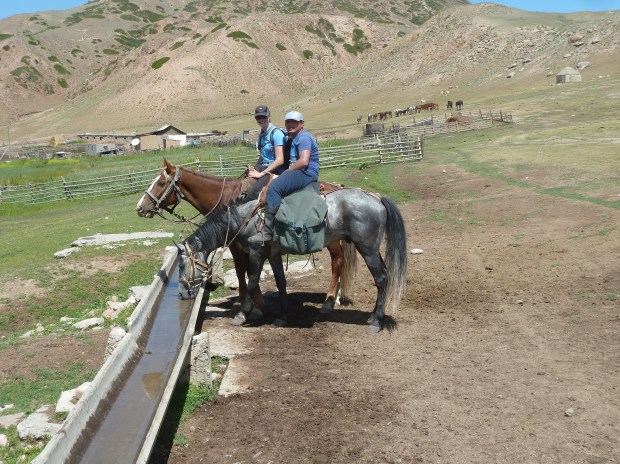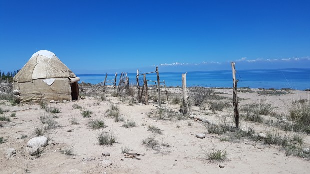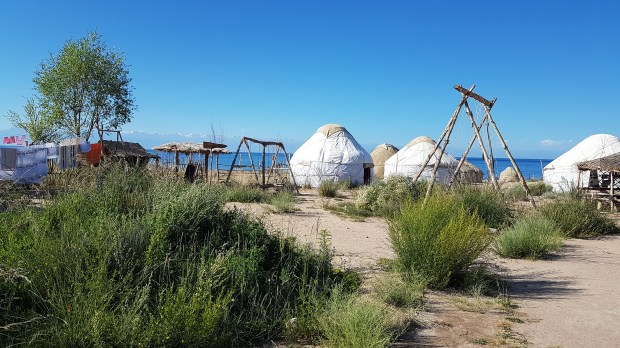 Beim zweiten Anlauf im CBT-Office machen wir schließlich für den nächsten Tag eine 2-tägige Pferde-Trekking-Tour auf den 3847 m hohen Hausberg Tashtar-Ata klar. In der Umgebung von Bokonbaevo gibt es zwei Yurt Camps direkt am See. Wir wählen das einfachere und lassen uns vom Taxi hinbringen. Die Zufahrt ist eher weniger bekannt und fast schon feldwegmäßig abseits gelegen, aber der Taxifahrer freut sich mit uns, dass er uns schließlich doch noch ans Ziel gebracht hat und schenkt uns zum billigen Fahrpreis noch eine Flasche Mineralwasser mit Geschmack. Witzigerweise erweist sich gerade dieses Getränk als total lecker und ab dem Zeitpunkt sind wir in allen Läden auf der Jagd nach genau dieser Marke.